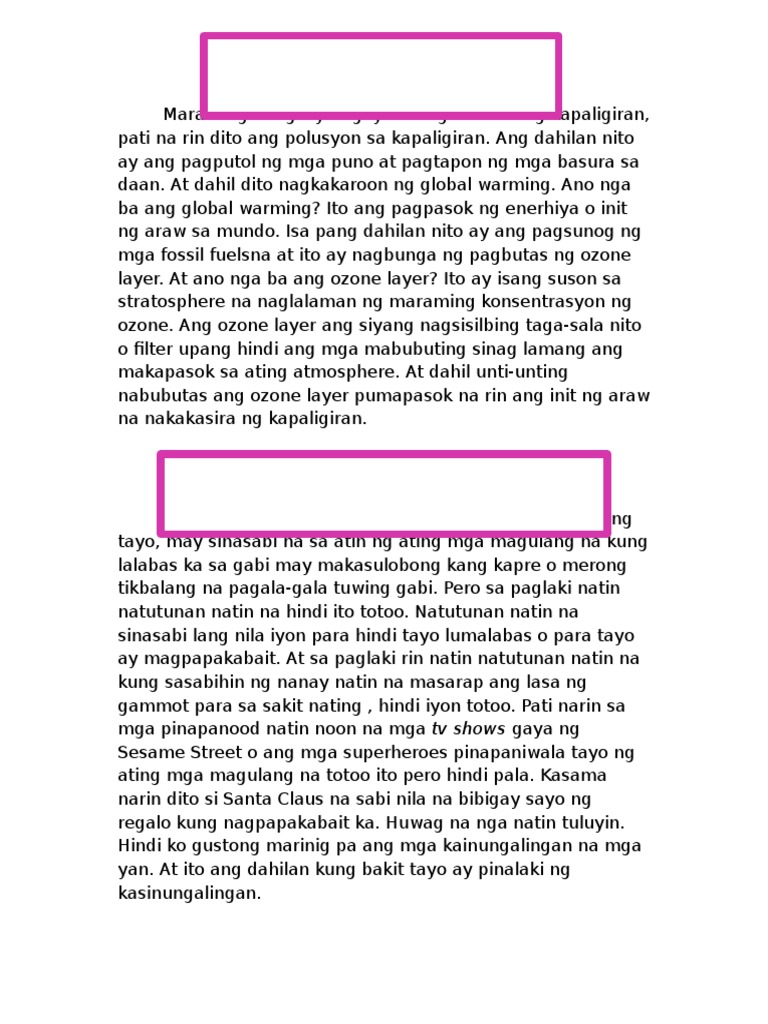 At dahil unti-unting nabubutas ang ozone layer pumapasok na rin ang init ng araw na nakakasira ng kapaligiran. Dito nakasalalay ang kinabukasan natin. Isang sanaysay sa Filipino.