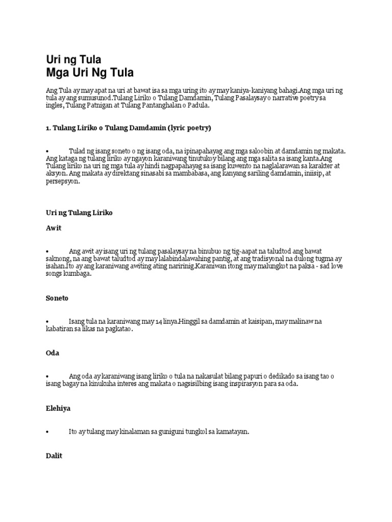 Oda tulang nagpapahayag ng paghanga o pagpuri sa. Ang mga uri ng tula ay 1Tulang Liriko 2Tulang Pasalaysay 3Tulang Dula o Pantanghalan 4Tulang Liriko. Dalawang uri ng tulang dula.